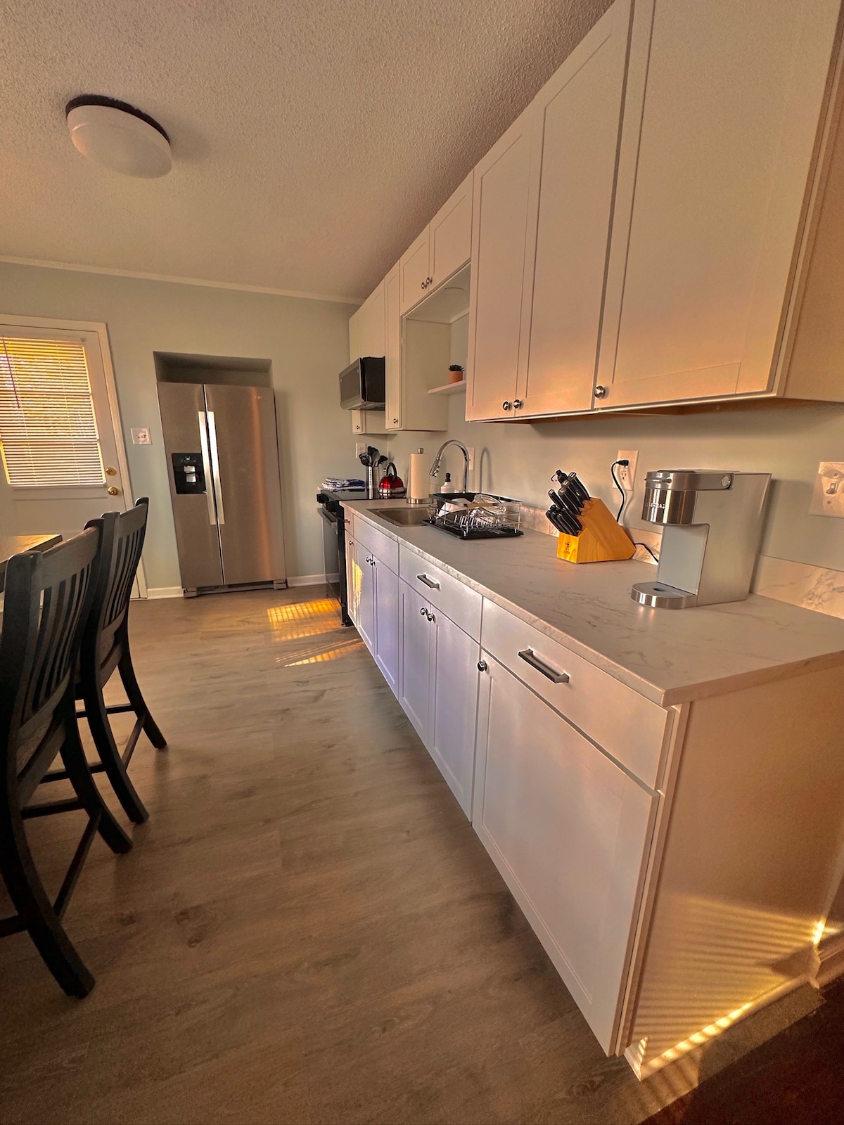 Newly built home in a tranquil setting, nestled among treetops, with a large covered porch where you can view the sunrise over the river or just relax in the rocking chairs. Filled with natural light and comfortably decorated. Oversize bedroom and bathroom with walk-in shower. Sleep up to 4 with very comfy inflatable mattress (available upon request, additional fee applies).Large fully equipped kitchen. Less than 2 miles from downtown. Book this beautiful home for an enjoyable stay in New Bern.