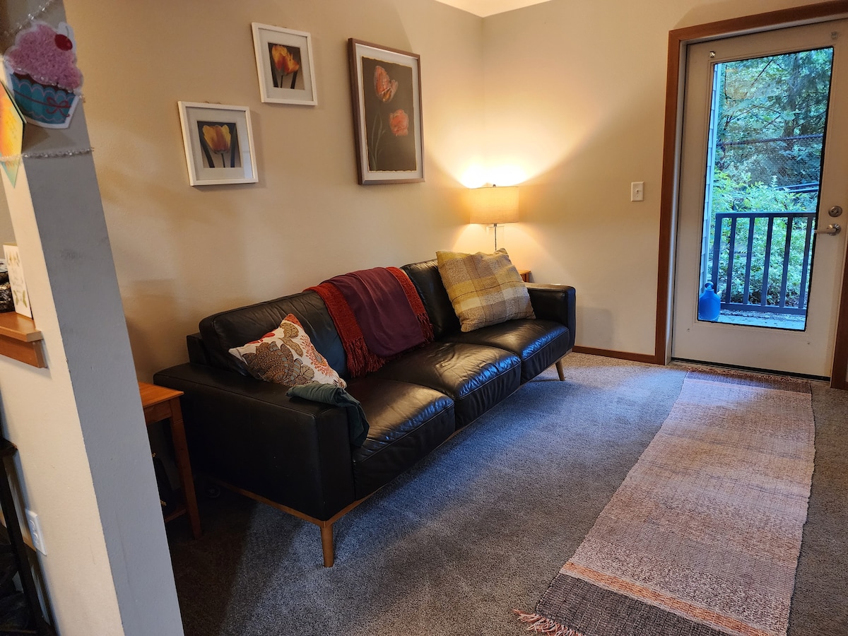 Welcome to your hideaway studio on a quiet, forested lot, yet just a few minutes away from essential services and twenty minutes from downtown Seattle. You'll enjoy the entire studio with a queen bed, one bathroom, sitting area, and a kitchenette with a fridge, microwave and coffee maker. The studio is attached to our home and has a private entrance from the back yard. Take a stroll down our trail to McAleer Creek and enjoy the Overlook Deck with your morning coffee or an afternoon beverage.