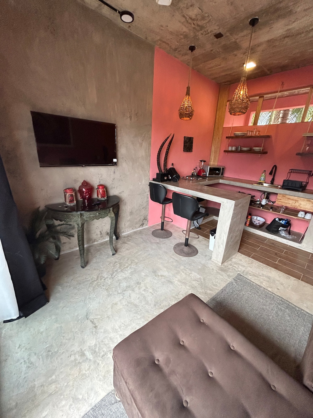 This unique place has a style all its own. It has a queen sized bed, a/c, excellent internet (STARLINK), private bathroom with hot water, smart tv and a closet. Small kitchen, fridge perfect if you like to cook your favorite dish while on vacation. Also it has a balcony with a nice view perfect to sip some coffee and relax. We are less than 3 minutes away walking to zicatela beach and it’s located at a peaceful neighborhood (located 3rd floor)