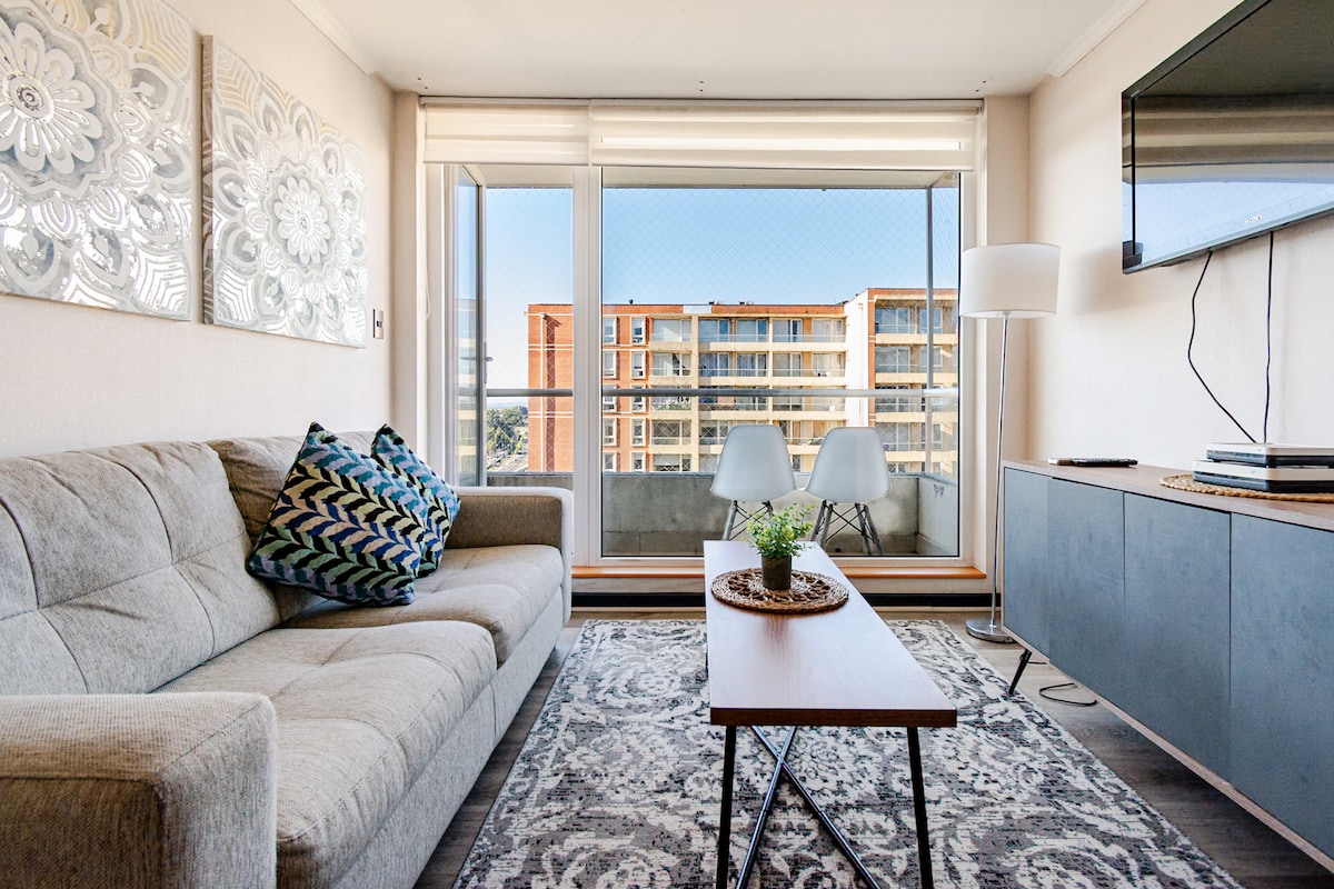 Modern 1-bedroom apartment on the 15th floor with panoramic views of Concepción and unique sunsets š. Bright and cozy space, ideal for relaxing, working, or long stays. Features a comfortable living room šļø, fully equipped kitchen š©āš³, fast Wi-Fi š, TV with Netflix/Disney+ šŗ, and a double bed šļø. Centrally located, just steps from downtown, universities, restaurants, and public transport š. š Automatic discounts from 2 nights š