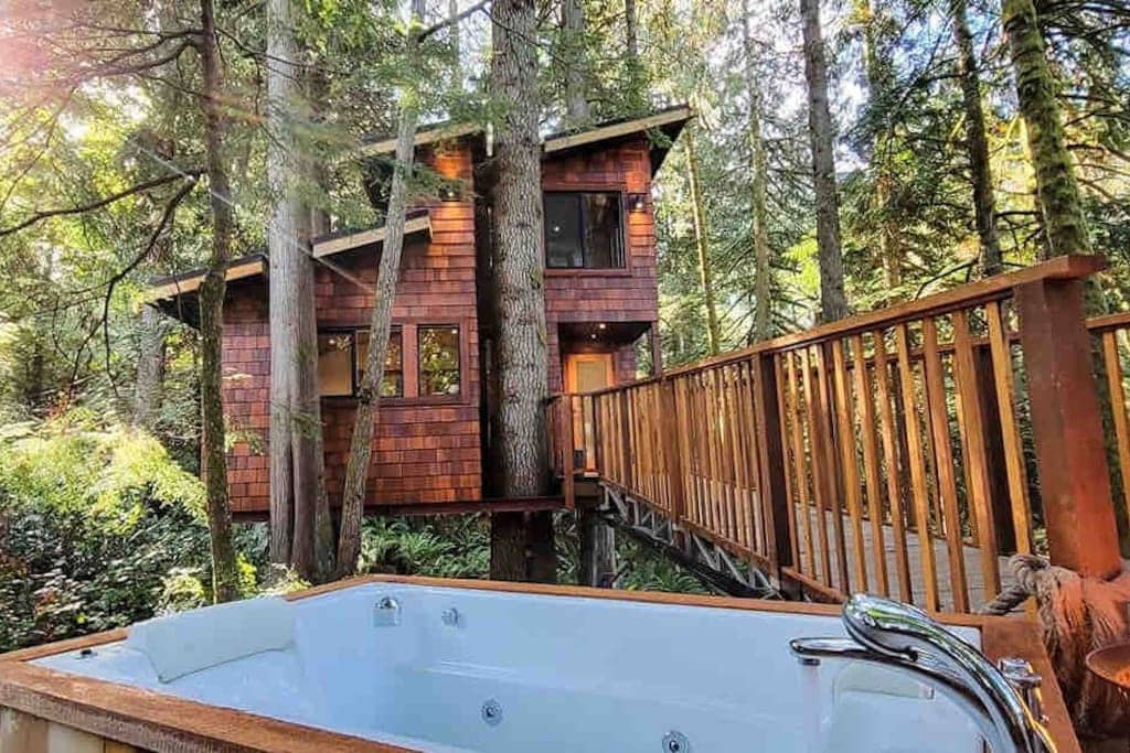 A truly unique treehouse perched 30 feet high among the trees. This amazing structure is attached to 3 large cedars and 1 giant maple using advanced tree tabs that allow the trees to sway gently, providing a natural and immersive experience. The large deck offers stunning views across the Salish Sea to the Mountains of Washington state. With all the modern amenities you could need, it's the perfect place to relax and unwind. Experience the magic and wonder of treehouse living for yourself!