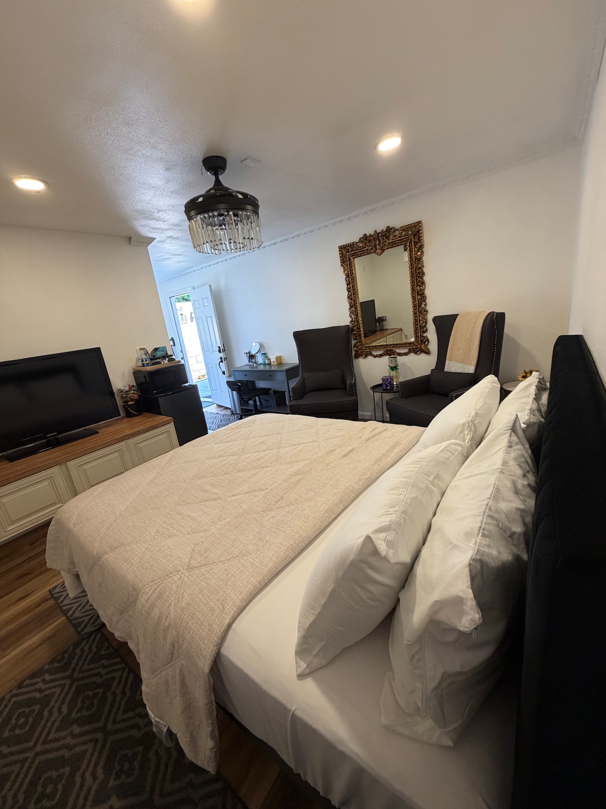 Enjoy comfort and privacy in your fully remodeled suite with a private entrance. The master bedroom offers a massage queen bed, lounge chairs, and all the essential amenities (please note:NO kitchen) Indulge yourself in the spa-style bathroom, featuring a large rain shower, six body sprays and a smart toilet! 📍Just 4.8 miles from Disneyland 🎢 2 miles from Knott’s Berry Farm 🚗 Minutes from the 5 & 91 freeways Perfect for a peaceful getaway with easy access to top attractions in Orange County!