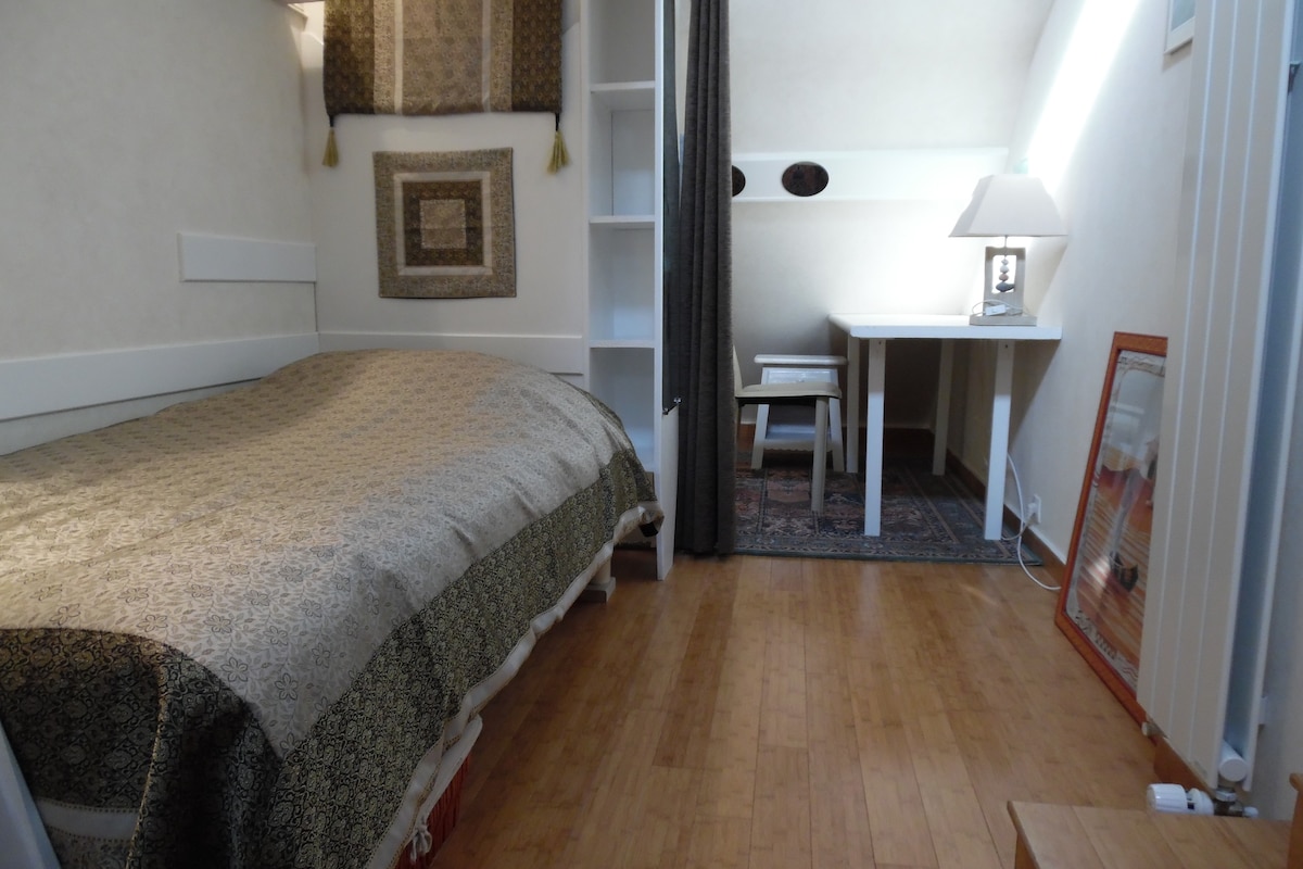Independant house, near from the main house, fully equipped, with a private terrace facing south, not overlooked, with table and chairs. Free bike loan. Many public transportation from 50m of the house for: plateau of Moulon, plateau of Saclay, the faculty of Orsay, RER station "Orsay-ville", and the CEA. The RER station Orsay-Ville is also accessible by foot in 10-15min. Many shops within 10min walk (pharmacy, butcher, bakery, supermarket).