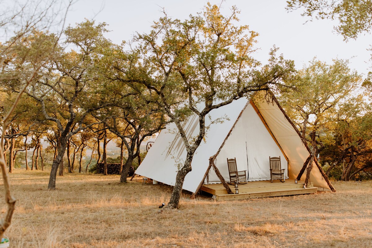 Voted #1 most beautiful Glamping in Texas. Ultra-comfortable hybrid tent/cabin (with AC, heat, and hot tub!) = the ultimate getaway. Everything you need for a memorable, easy getaway is here - paddleboards, kayaks, yard games, an outdoor movie station, fire pit, grill, refrigerator, coffee, hammocks, yoga mats and more. New hot tubs, winter 2024. Sweeping views of the hill country and Lake Travis greet you at every turn. Lake Travis access - 2 mins away. Flat Creek Winery - 10 mins away.