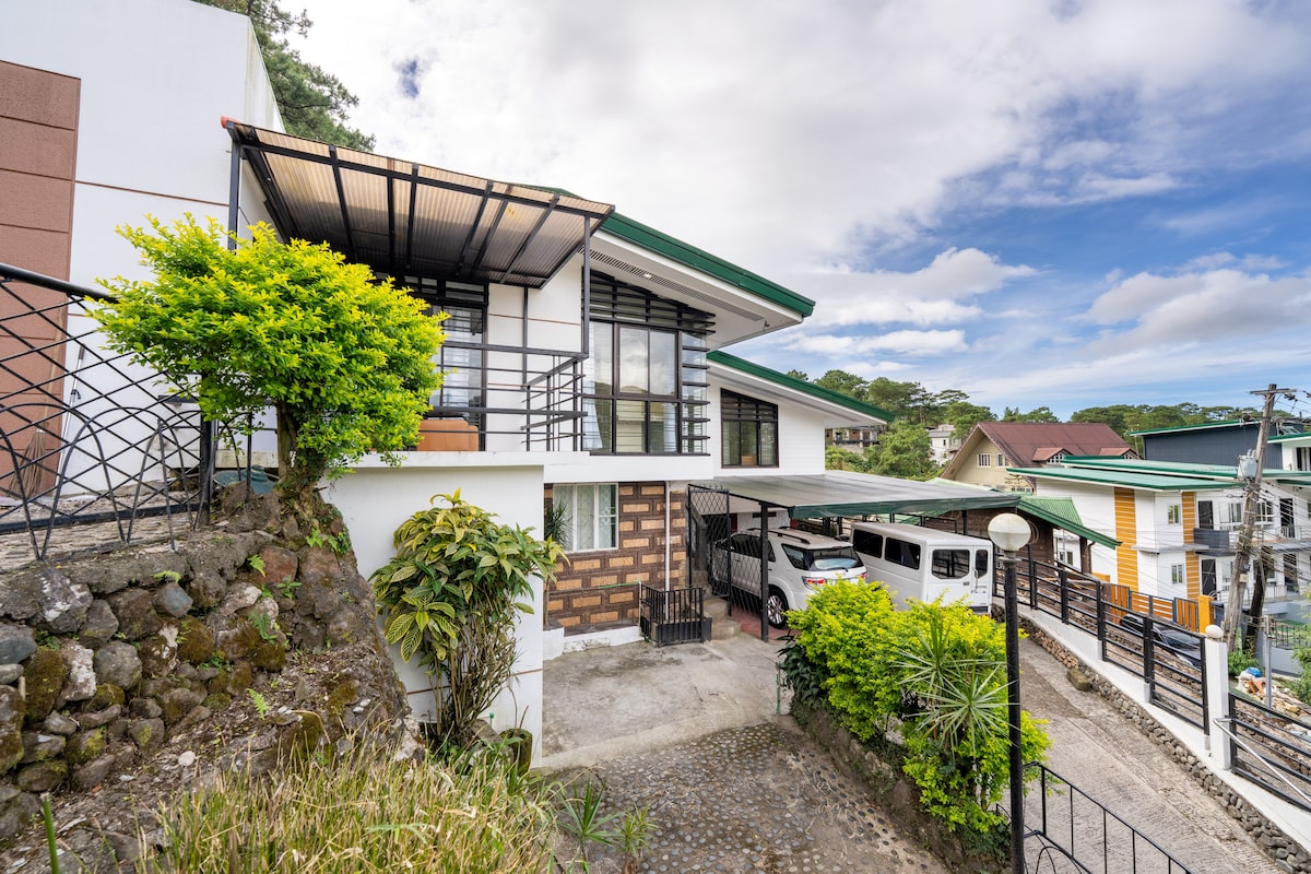 Enjoy mountain views and crisp fresh air in this cozy, stylish and charming home 10 minutes from restaurants and attractions such as Camp John Hay, Mines View Park, The Mansion House and others. Perfect for families and groups of friends, this pet-friendly and wheelchair-accessible home offers an indoor fireplace, 2 outdoor fire pits, 4 bedrooms with bathrooms, a full kitchen, alfresco dining, front and back yards; cableTV, karaoke machine, & fast internet for those who wish to work from home.
