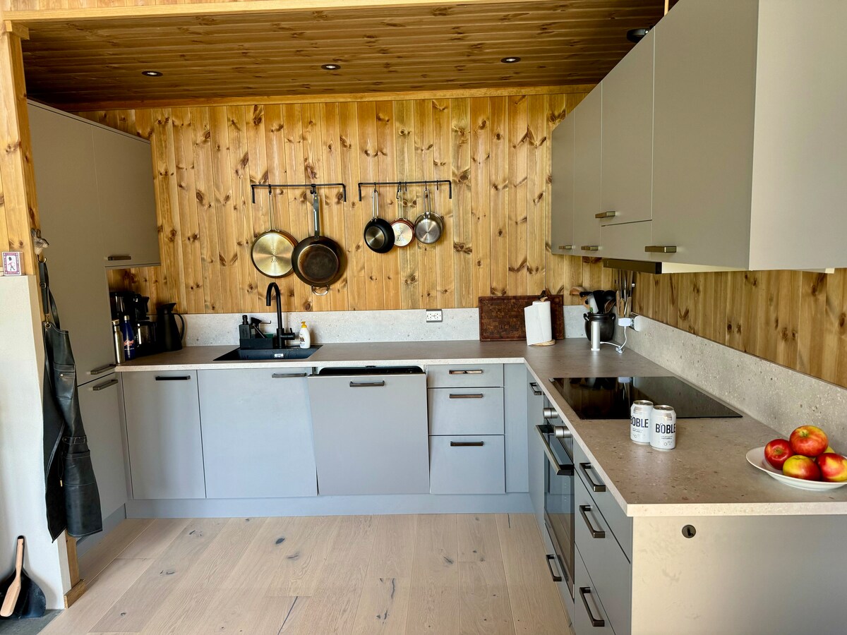 Nordic design cabin with panoramic mountain view