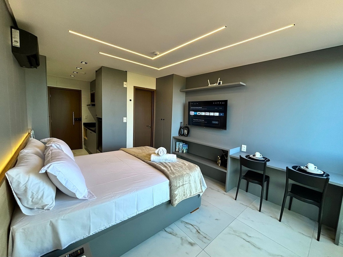 Mediterranean studio on the sand in João Pessoa. With white and blue decor and rustic details that bring the charm of Greece to the coast of Paraíba, this compact and cozy studio overlooking the sea is ideal for couples or solo travelers. A charming retreat, perfect for relaxing, without giving up comfort and a perfect location, close to great restaurants and tours. Complete and well equipped, it also has a leisure area with a swimming pool, gym, laundry and parking.