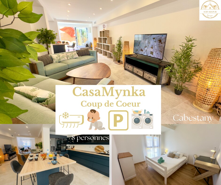 🏡 Casa Mynka is a fully renovated vacation home, ideal for families and teleworkers, between sea and mountain. Located in Cabestany, in a quiet subdivision, it is minutes from Perpignan and the beaches of Canet-en-Roussillon and Saint-Cyprien. Air conditioning, high-speed WiFi, 3 office spaces, terrace, baby equipment and free parking ensure a comfortable, convenient and serene stay.