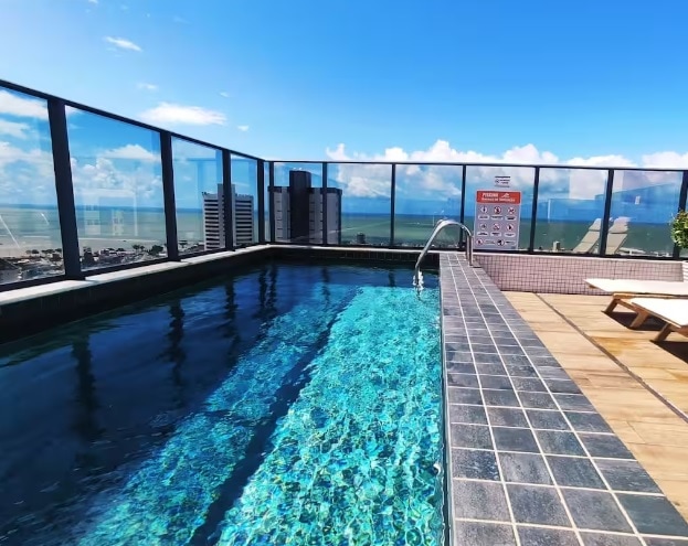 35m² apartment located in the best location in João Pessoa: on the seafront of Cabo Branco! You will have at your disposal a super comfortable apartment, with bed and bath linens, Wi-Fi, Smart TV, dishes, cutlery and several other essential amenities for your well-being! The common area features a swimming pool, restaurant, parking and a coworking meeting room. The region is super safe and has easy access to everything you need (bars, bakery, pharmacy, supermarkets, the best restaurants in the city).