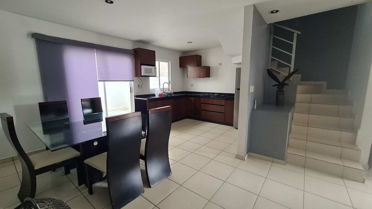 This unique accommodation has plenty of space for you to enjoy with your family, it is very close to: IMSS Terranova, Airport, Plaza Explanada and Ceiba, USE, Central Milenium, among other places of preference, it consists of 3 bedrooms: 1 with 2 single beds, 1 with double bed and 1 with QS bed, A.C. throughout the house, garage for 2 cars, 1 full bathroom on the upper floor and a half bathroom on the ground floor, boiler, blender, coffee maker, microwave, among other utensils...