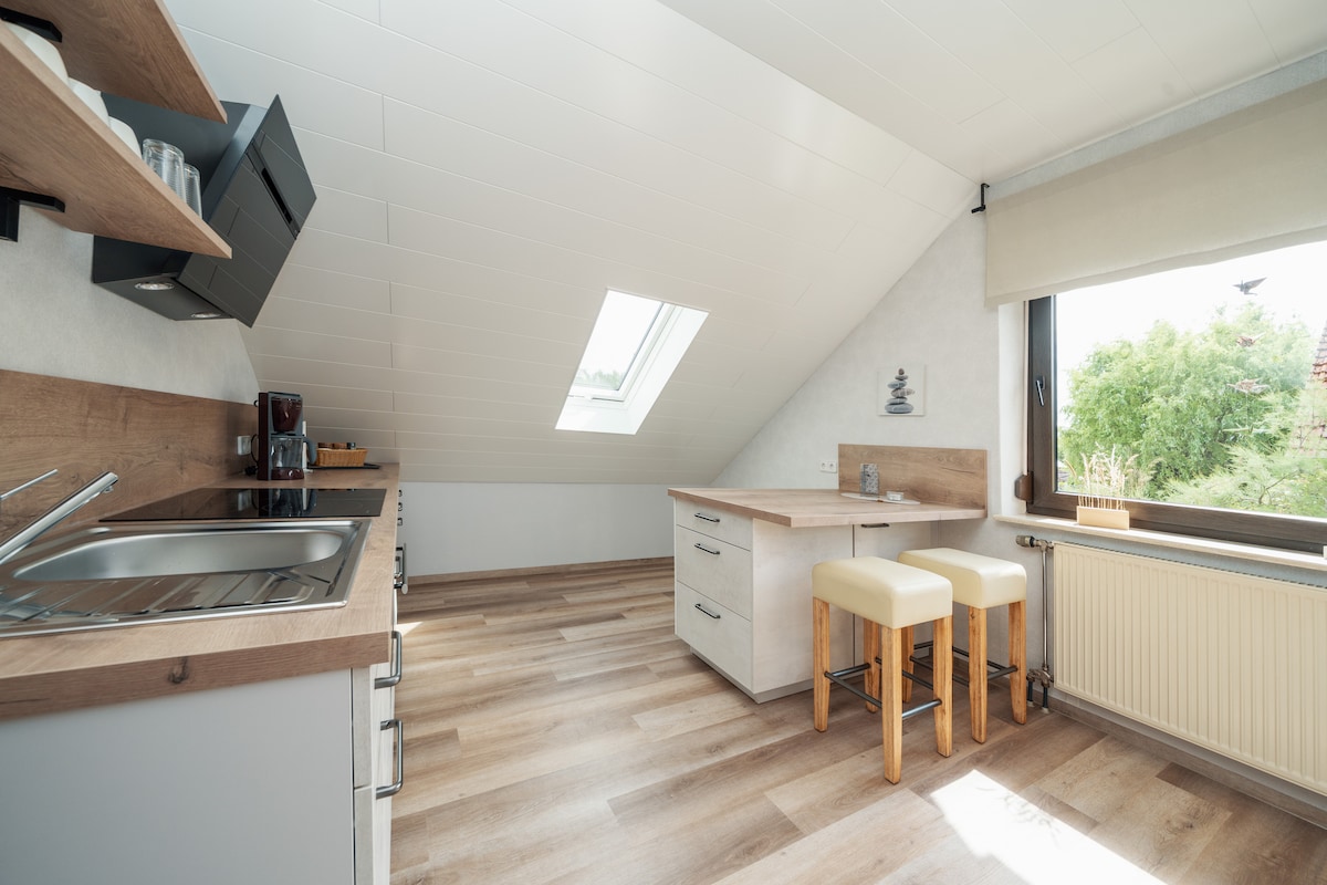 Cozy non-smoking apartment ideal for hikers, cyclists and Kassel explorers. Two flights of stairs lead to your bright oasis of tranquility. The large kitchen/living room is the center of your self-contained apartment. The small table in the dormer window is also suitable as a mini office. The bathroom invites you to linger with a spacious shower and modern design. In the bedroom, a double bed (1.6 m x 2.0 m) awaits you. The chaise longue can also be used as an extra bed.