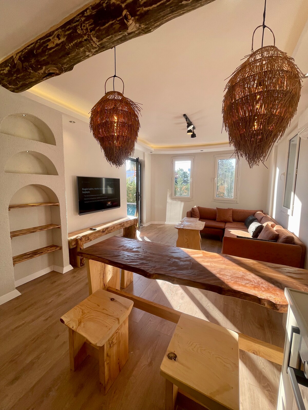 It is located in Fethiye, within a 5-minute walking distance to the beach, the region's largest beach park (with playgrounds, recreation and sports areas), supermarkets, cafes and restaurants. It has 24-hour hot water, unlimited and uninterrupted internet. The apartment has a pool view and the rooms are air-conditioned. All kitchen utensils and basic materials such as iron, hair dryer and towels are available. The TV is a large screen 126" Android smart TV.