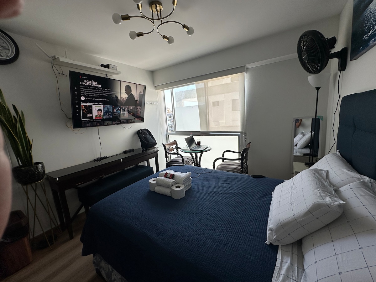 Cozy studio right across from the San Miguel boardwalk and Media Luna Park! Walk by the ocean, relax, and enjoy quick access to Costa Verde, Miraflores, Barranco, Arena 1, Costa 21, and the airport. You'll have 24/7 security, fast Wi-Fi, and a Smart TV with Netflix, Disney+, HBO, Prime Video, and YouTube Premium. Perfect for travelers looking for comfort, great views, and a peaceful stay by the sea.