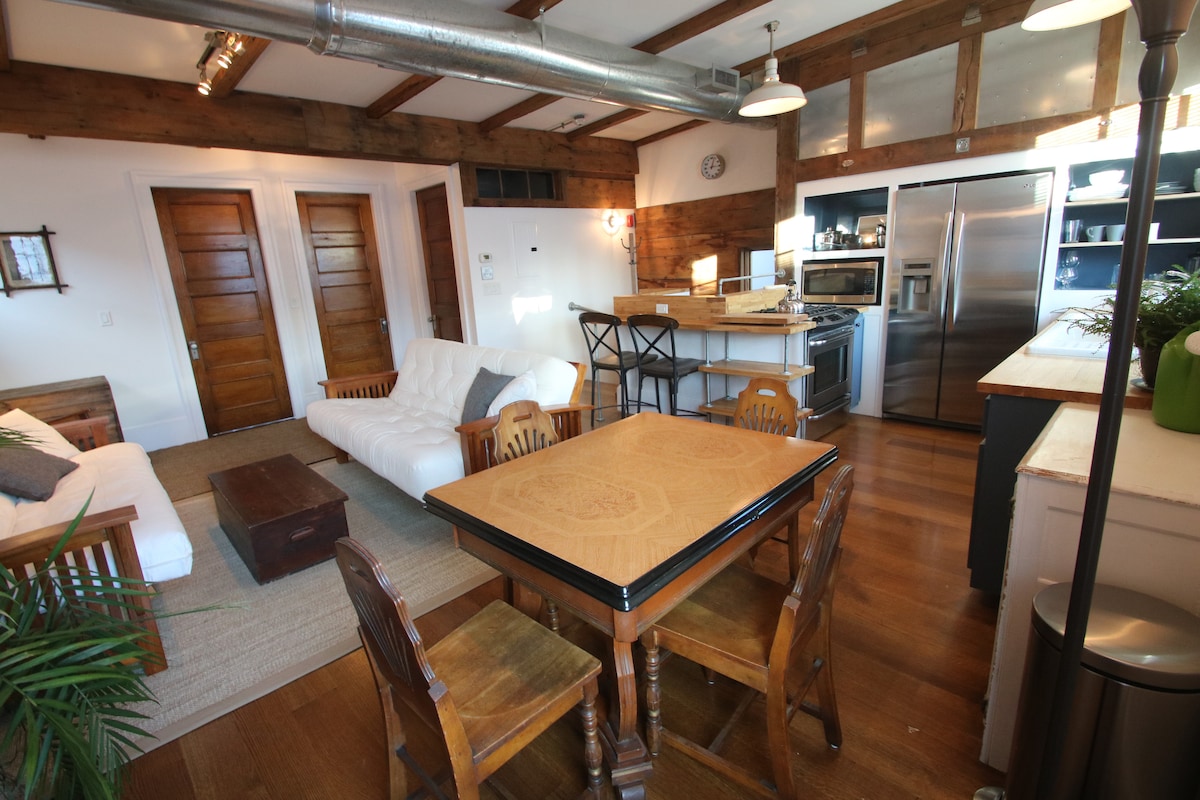 This 600 sf apt with roof deck on the third floor of an old Victorian home is bright and airy. Surrounded trees it does become a sanctuary, a place to call "home". Centrally located and within walking distance to MIT, Novartis, Harvard. It is within minutes walk to the Central Sq subway, station. The apartment is efficiently laid out with a loft feel. It has a bedroom with king size bed, bath, kitchen, and living area with a ligne roset pullout couch/bed, plus a 230 feet deck.