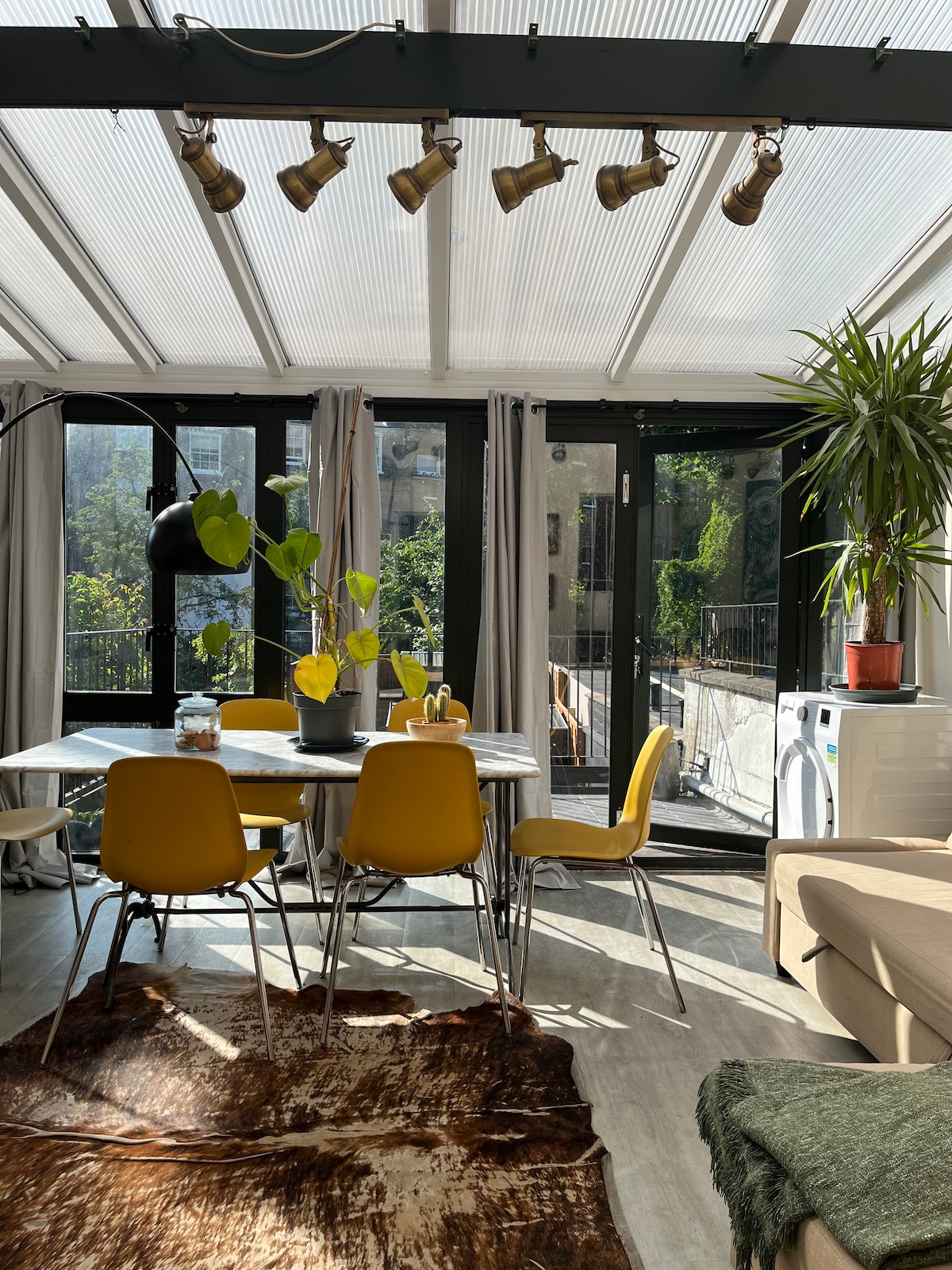 Enjoy a relaxed, comfortable, stylish stay in the heart of London’s best served and safest area. A real find: it’s spacious and beautiful with 2 bedrooms, 2.5 luxury bathrooms, full kitchen, 2 reception areas. With a super-king size master bedroom and a double guest room (+ a sofa bed in living room) all with fresh crisp lux hotel quality linens. Plus a centrally heated indoor-outdoor walled garden space under a glass roof, a unique and gorgeous addition to our Victorian home