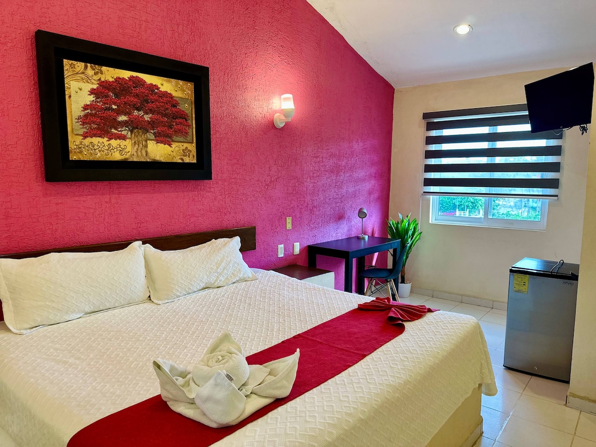 This hotel room has been designed to give May comfort and privacy. It is located in a new boutique hotel a short walk from the boardwalk and downtown Campeche. The room has a double bed, WIFI, private bathroom, hot water, cable TV and Netflix. The pool is heated and perfect for relaxing and enjoying your stay. Perfect for travelers looking for a clean and safe spot with a luxury design.