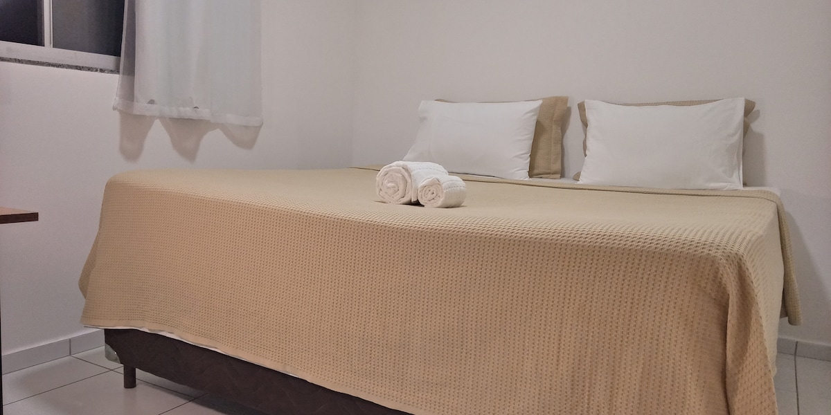 Attention: Apartment on the 3rd floor without an elevator and without accessibility, you need to climb the steps. It accommodates up to 6 guests with fans: 2 in the double bed suite, 2 in the double bed room and 2 in two single mattresses on the floor, total of 6 guests, all with sheets and pillows. The apartment has an area of 107m² with a living room for two environments, a balcony, 2 bedrooms, one being an en-suite, and a total of 3 bathrooms, a full kitchen and a service area! We have 1 parking space.
