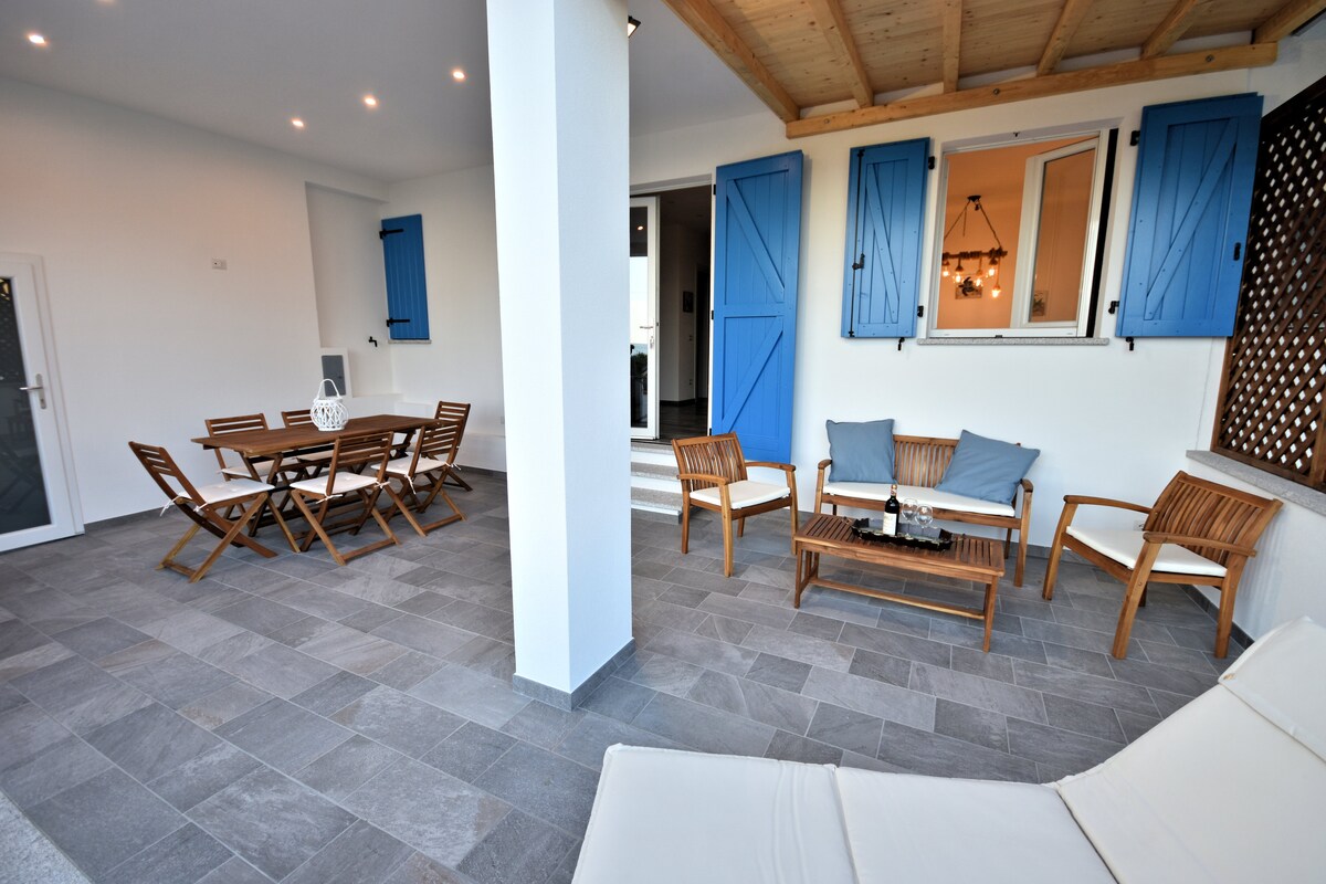 New apartment consisting of a double bedroom with television and large wardrobe, bathroom with shower and toilet, living room with sofa bed, television, equipped kitchen, dining table. Fully air-conditioned. Wi-Fi available. Outdoor veranda with relaxation area and table, perfect for summer lunches and dinners. Adjacent private parking. The apartment has a large garden, where there is a swimming pool. The pool is shared with the main villa.