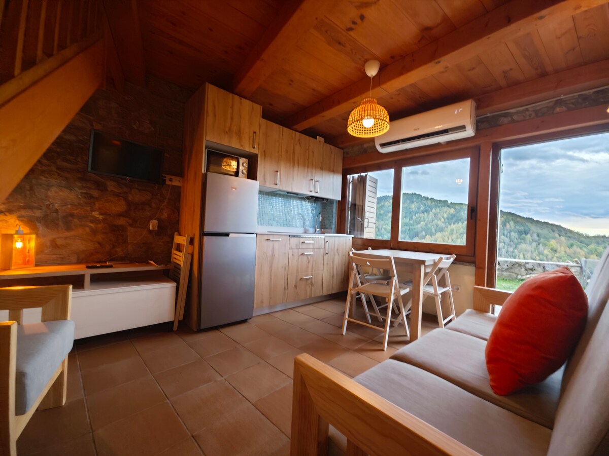 L’apartament per a 2 persones independent. Consta d ‘un dormitori de matrimoni amb bany, una sala amb cuina-menjador i un plegatí. Se situa en una casa de pedra situada en l’antic camí romà imamb vistes al Parc Natural debla Garrotxa. Apartament equipat amb microones, petit forn, cuina, nevera, bullidora, torradora, productes de neteja. Ideal per visitarvla Garrotxa, degustar la bona cuina de la comarca, excursionistes i amants de la natura.
