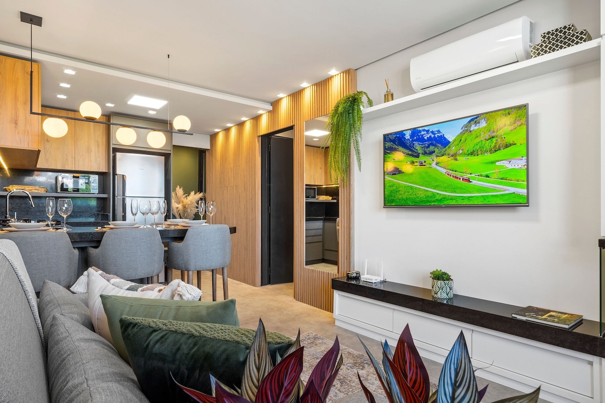 Come and enjoy wonderful moments. The apartment is located next to the following tourist attractions: Ferris Wheel; Mundo A Vapor; Space Adventure (Nasa Museum); Fashion Museum and Havan store. It has 100 m² of private space, a full kitchen with a barbecue grill, a large living room with a fireplace, a hot and cold air-conditioner, a Smart TV with Netflix, a super comfortable sofa, a balcony overlooking the tourist attractions (with soundproofing), and a private parking space. Perfect for couples and families.