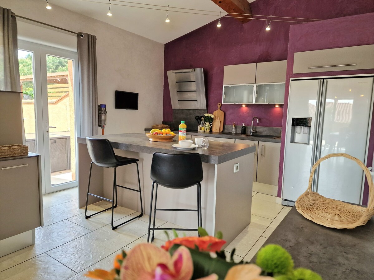 Discover this atypical accommodation for unforgettable moments! Enjoy the hot tub in winter, as well as refreshing in summer Open 24/7, Totally Private, out of sight, nestled in an "interior" garden. You'll be amazed! This air-conditioned house is within walking distance, just a few meters from grocery stores, bakery, small restaurant, minutes from the sea by car!