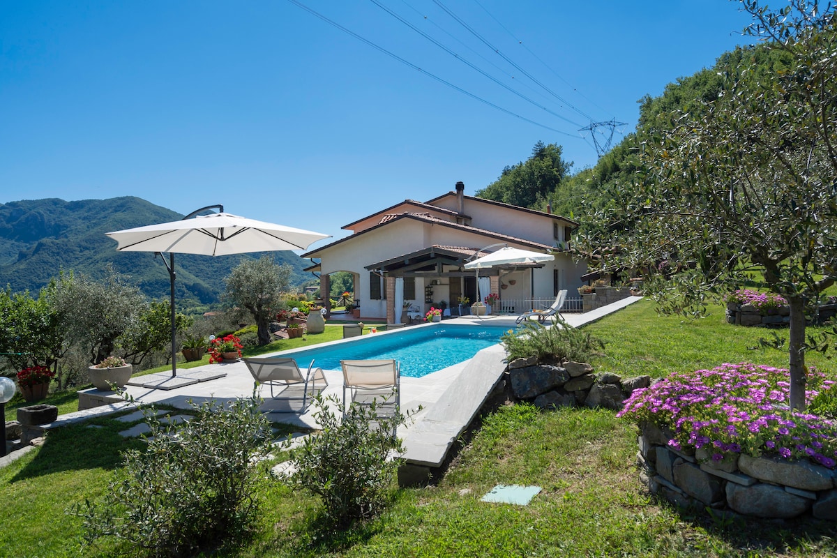Embedded into the lush green of the famous Tuscan hills and surrounded by a breathtaking mountainous frame, the Villa rises from an old farmhouse completely restructured, in an oasis of natural peace constituted by 4 houses to 2.5 km from the center of the most important and famous village of Garfagnana: a beautiful area about 50 km north of Lucca, 80 km from Pisa International Airport, about 100 km from Florence and 50 km from Forte dei Marmi, an exclusive seaside location.