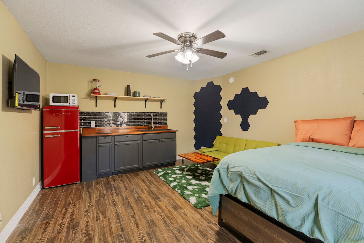 Chic, pet-friendly studio in a central Pensacola triplex—your private retreat awaits! Enjoy a fully private entrance & suite, renovated kitchen & bath, cozy bed, futon, retro appliances, cooktop, and smart TV. Relax outdoors with shaded seating and a hammock, or unwind indoors with your own washer & dryer. Pets welcome with approval & small fee (must be trained). Close to downtown, beaches, and local eats—comfort, style & convenience all in one charming spot!