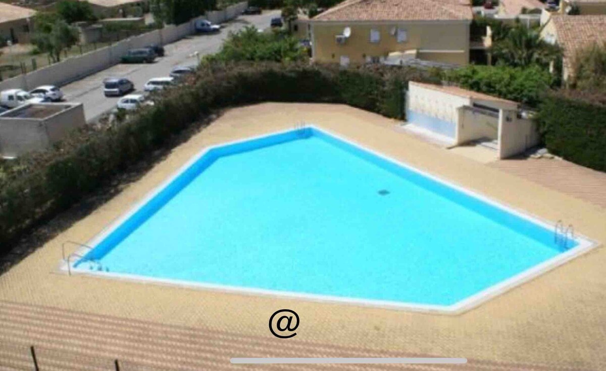 Studio (LOW mezzanine) 35 m2 4 people (2+2) Secure residence 2nd floor Equipped terrace Unobstructed view. Free parking 137 spaces 50 m away (cameras) Petanque court. - 100 m from the large Casino Beach, long Rambla along the sea - Nearby Amenities Restaurants/Casino Games/Shops (Carrefour market 50 m away) 800 m center -100 m Bus Béziers Villages nearby - Patio with Trees Bike Rack - WiFi/Netflix - 1 bedroom Mezzanine LOW Bed 140 - 1 Sofa Bed 140 Shower Toilet Bike path under residence