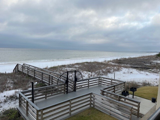 White sand beach just steps away & beach views. Spacious end-unit, on the beach side of Hwy 98 — walk to Mango Marley's and NEW "Bear Pizza". Coffee, ice cream, and several shops are only a 2-minute stroll away. 2 King suites (one with 2 twin beds) both with TVs Quality queen sleeper sofa 70" TV in the living area Washer & dryer High-speed WiFi 3 private decks with beach views/sunsets Grill Gas firepit Outdoor HOT shower Beach/fishing cart Beach chairs Bikes Extra parking