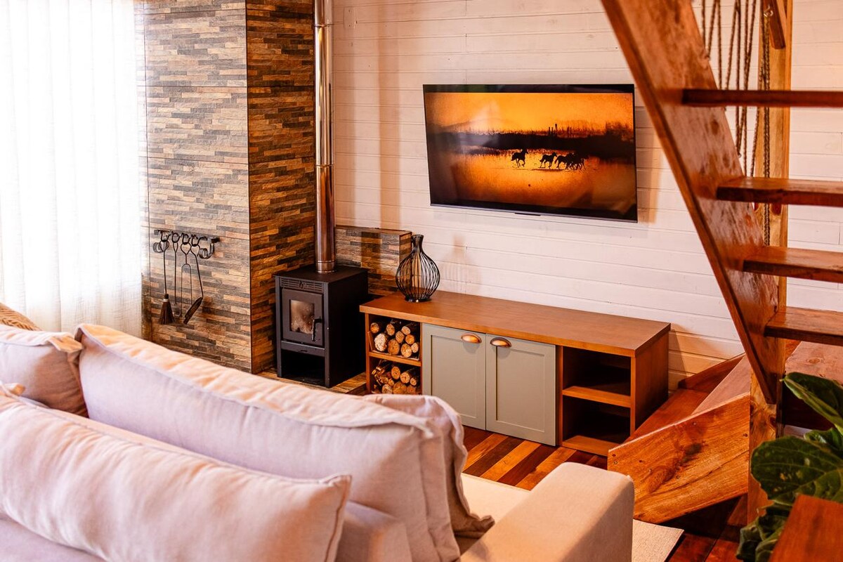The Cruzeiro do Sul 3 Chalet has a modern, rustic and cozy farmhouse style, being a differential among the other chalets in our space. It has a full kitchen, whirlpool, fireplace, laundry and, in winter, a charming outdoor fire pit to make your stay even more special. It is just 2 minutes from Thermas Machadinho and is perfect for those seeking comfort, peace and contact with nature. Ideal for couples, families and pet friendly!