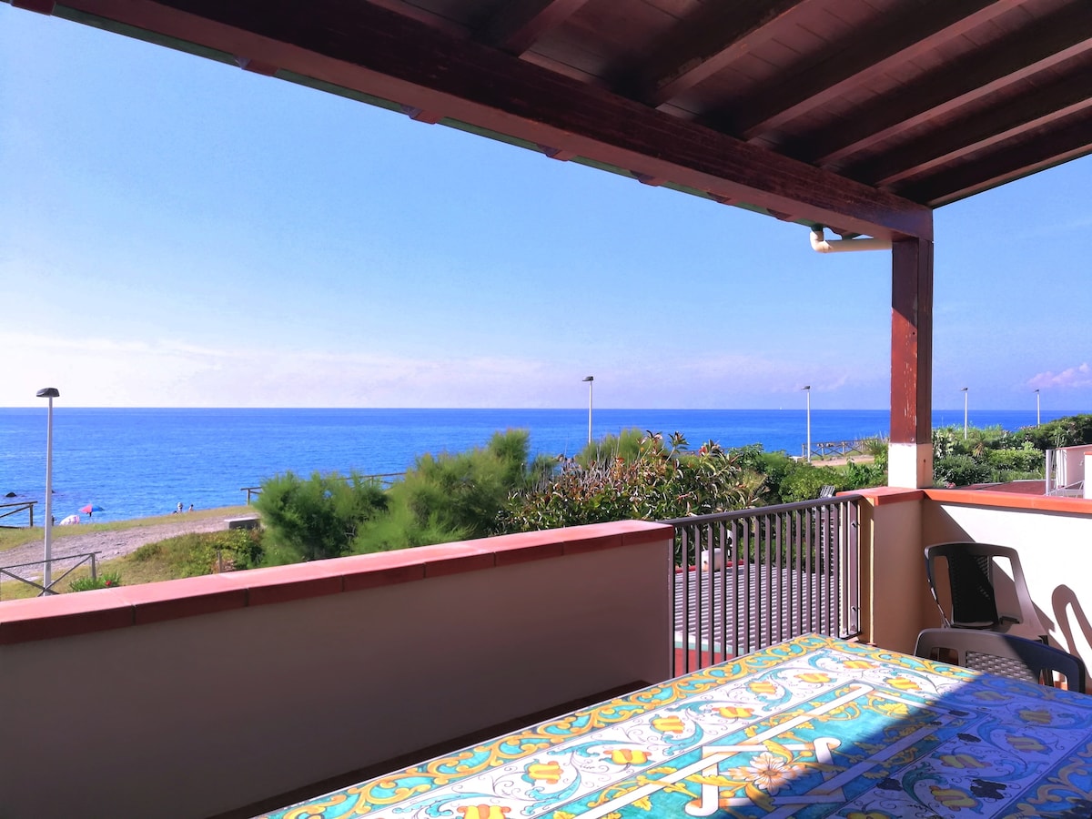 La caratteristica unica è una spaziosa terrazza arredata con tavolo e divanetti che si affacciata direttamente sulla spiaggia e sulle Eolie. L'appartamento ha una cucina luminosa completamente attrezzata di zona living con Tv 32'', lettore DVD, libri per adulti e per bambini, ed un comodo divano. Ha una camera da letto matrimoniale con balcone, una seconda camera dedicata ai più piccoli con un sicuro e divertente letto a castello e giocattoli per divertirsi ed un bagno con doccia a doppio getto.