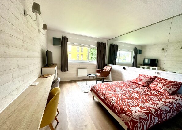 Welcome to this lovely renovated studio in Carquefou, in a quiet & secure hotel residence with a guard and free parking. Enjoy a fully equipped kitchen, cozy sleeping area, relaxing living room with TV and modern bathroom. Close to the Chantrerie Park, golf and shops, with easy access via public transport. 20 min from Nantes, perfect for a relaxing or professional stay!