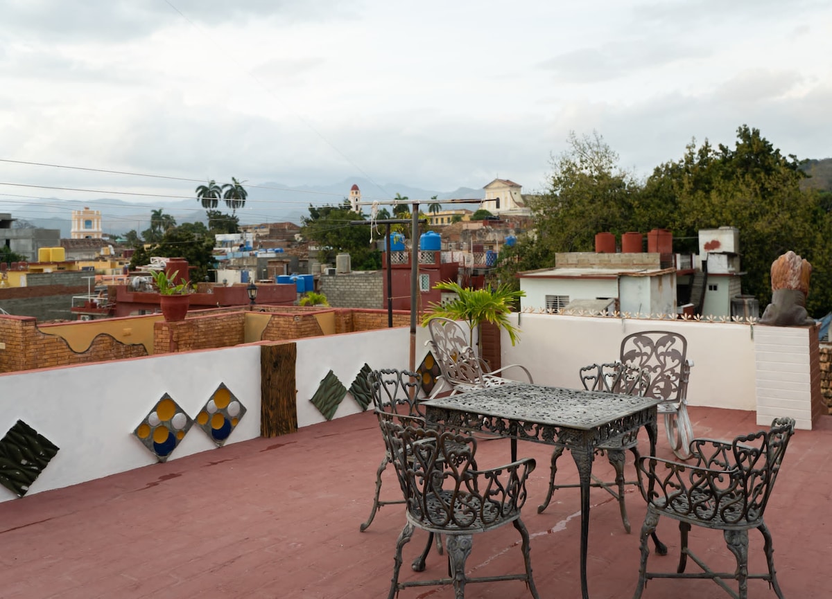 HOSTAL TERRAZAS BENJAMIN.Ubicado A pocos metros de área Histórica 5 Minutos de la Plaza Mayor.Mi casa cuenta con buena iluminación y ventilación,próxima a lugares de interés turístico como el camino a la piscina natural Hoyo del Pilón y la Plaza de las Tres Cruces.En Planta Alta con Habitación climatizada,agua fría caliente,minibar,baño independiente,terraza,done puede disfrutar,de un delicioso café cubano y exquisitos cócteles típicos del país.Se ofrecen Desayunos y Cenas. Coctel de Bienvenida.