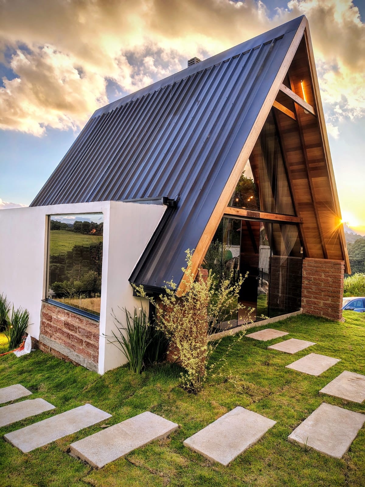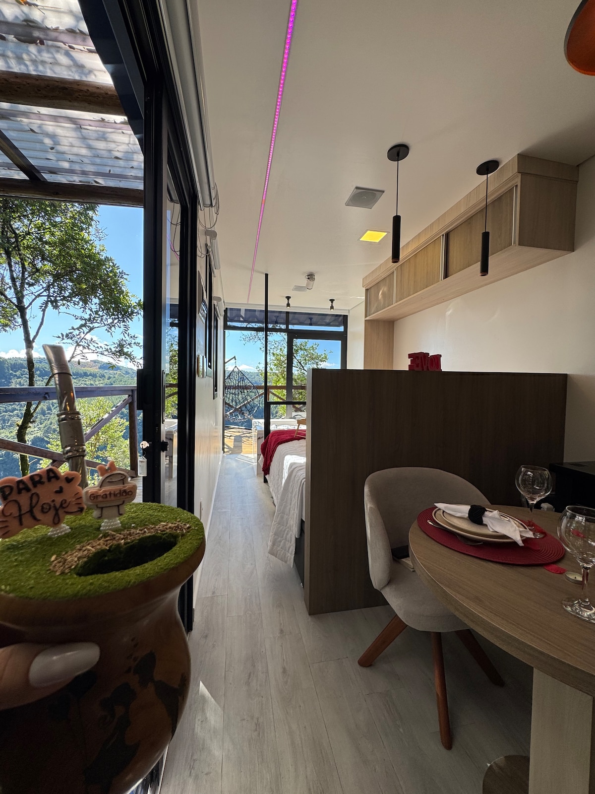 An A-frame cabin immersed in native forest and vineyards of a family of Italian origin. Designed to wake up to the sound of birds and sleep to the sound of water. The highlight is right at the entrance, the deck is over a waterfall. The kitchen is complete with high-quality utensils. The bathroom overlooks the forest, with a soaking tub and L'Occitane amenities. All rooms are decorated down to the smallest detail. Ideal for relaxing and getting into the right rhythm of life.