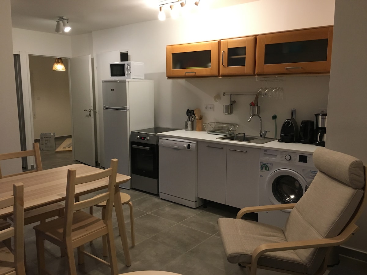 Rated 2 stars, 900 m from the thermal baths, cocooning and soothing accommodation, 31 m2 for a pleasant stay in peace. You will enjoy a large sunny terrace. SPA PACKAGE, contact me. All comforts, equipped kitchenette, living room with sofa bed, bedroom with 1 140 bed for 2 people and closets. Shower room and separate toilet. Washing machine, WiFi, TV. Private parking. Free shuttle during treatments. The Marsan greenway is 200 m away for hiking. Pets allowed.