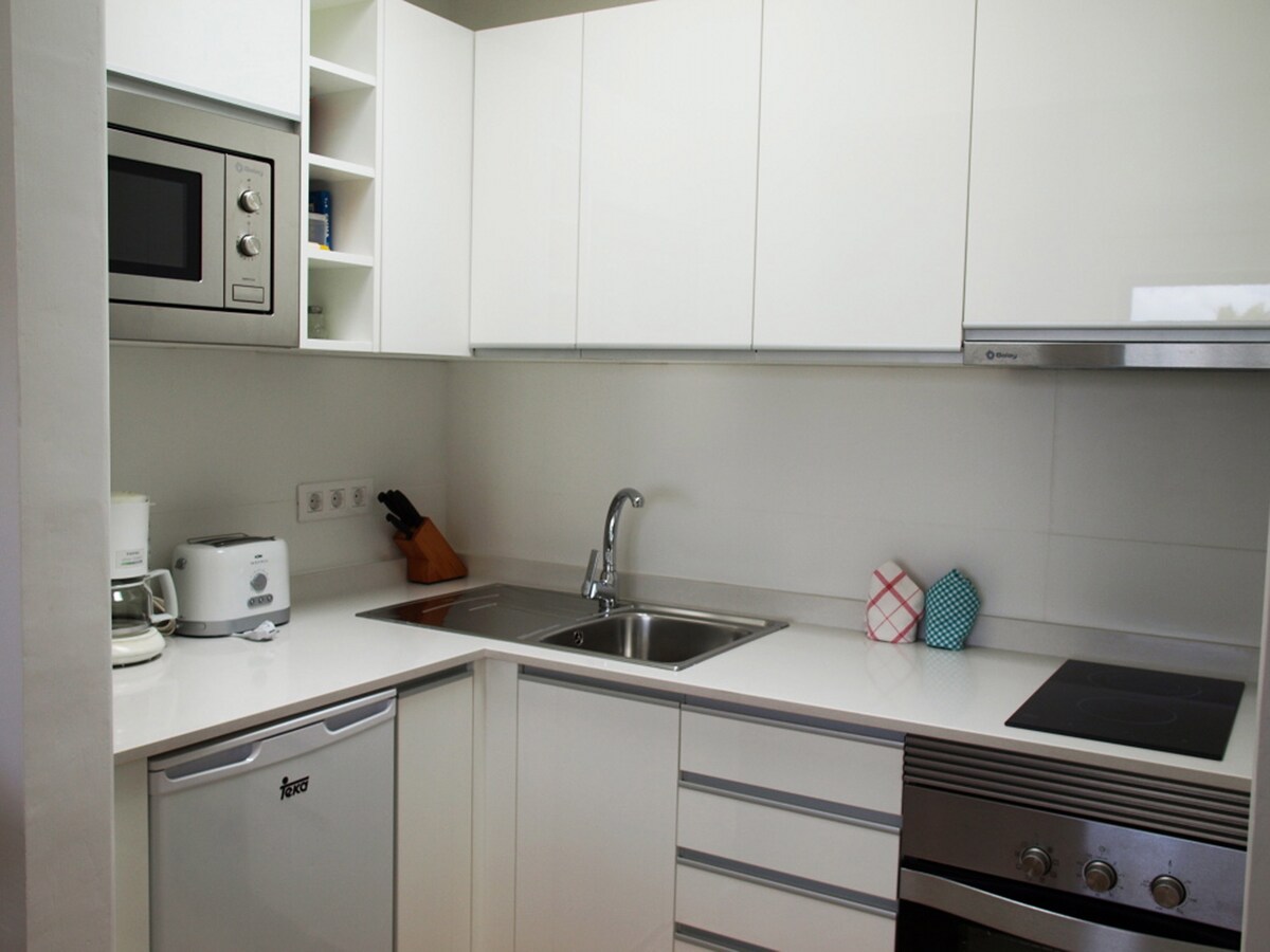 Spacious and bright apartment recently renovated and furnished in a fully renovated complex with a community pool. This luxurious apartment is ideal for its location, on a quiet street with a large free parking area, in the center, next to the Pueblo Marinero. Just one minute from Las Cucharas beach and shopping area. The apartment consists of a bright open kitchen with a living-dining room, two large bedrooms and two bathrooms. Separate terrace with direct pool access.