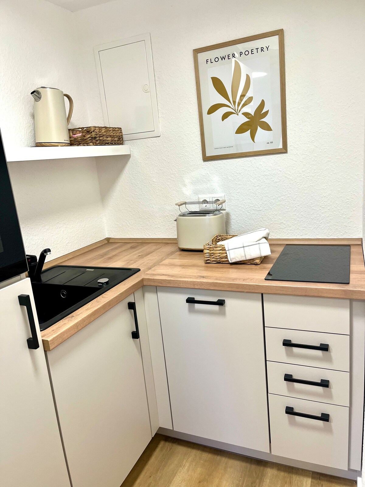 From our centrally located "Treetop Studio" you are in no time at all the important places. Close to the city with private parking, located on a federal highway, but still quiet with views of the countryside. Bus stops and post office right outside the door. Restaurants/fast food, supermarkets or a walk in nature within a few minutes' walk. A ramp outside the door, a reliable elevator and wide doors make the "Treetop Studio" barrier-free and wheelchair accessible