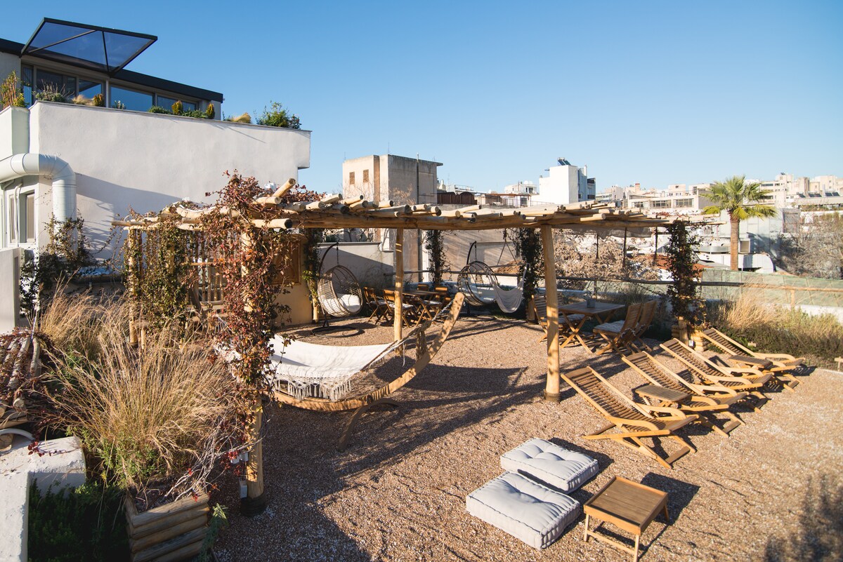 Modern,luxury,independent top roof studio in a very peaceful neighborhood of Ilioupoli.New 45 s.q.m.fully furnished and equipped on the top of a four-storey freehold house.Very bright,direct access to the private roof garden.Energy fireplace,air-condition,electric heater,home cinema. Quiet,cozy and clean,ideal for vacation rental! 5 min walk from two metro stations,Ilioupolis and Alimos.2 min walk from Vouliagmenis Av. and the bus stations to Glyfada,Varkiza and direct access to the Airport.