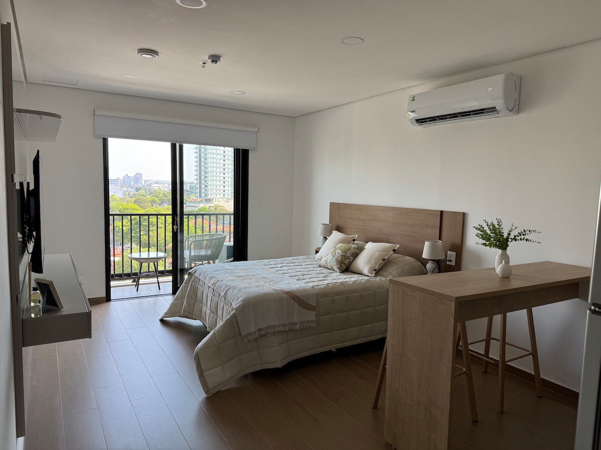 Welcome to your home in Asunción. Enjoy our modern 1-bedroom apartment in Recoleta, a safe and central location. Just steps from Shopping Mariscal and Villa Morra, you'll be surrounded by the city's best shops, restaurants, and cafés. The building offers 24-hour security, a swimming pool, a gym, and a coworking/barbecue area for 16 people with panoramic views. Ideal for couples or business trips, with WiFi, Smart TV and air conditioning.
