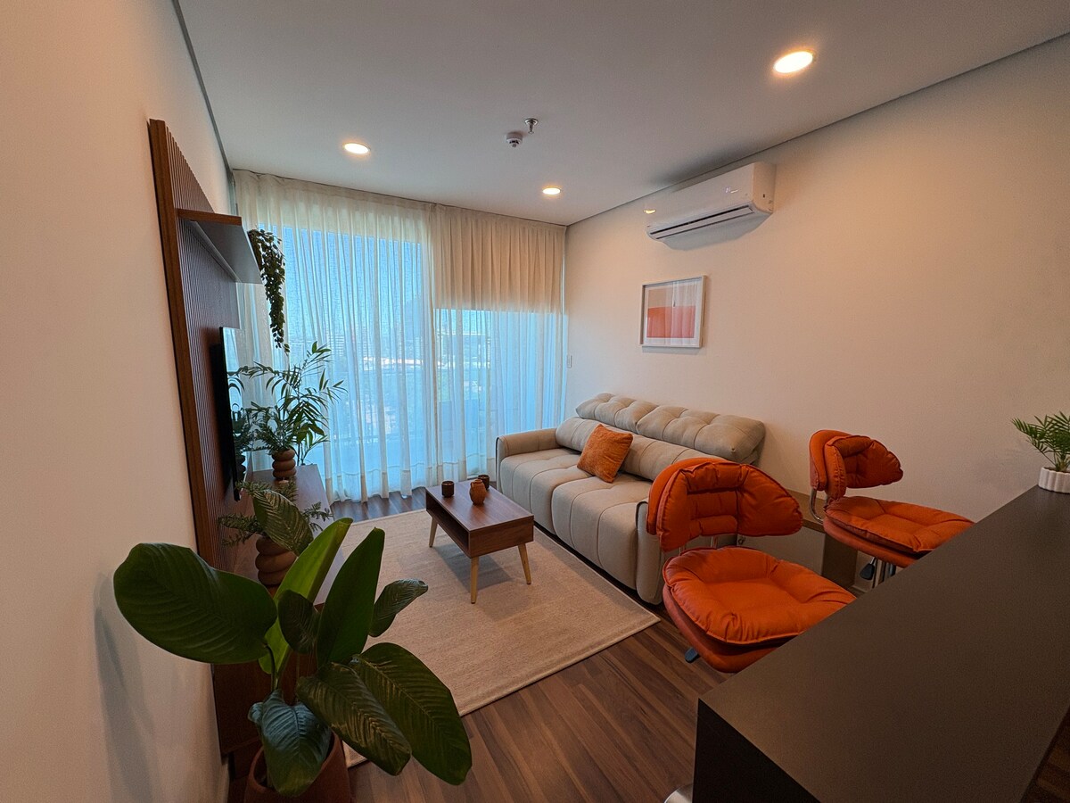 Brand new apartment in a luxury building. It has 40m² of its own, with Smart TV, WIFI, and in the building you have all the amenities: Swimming pool, air-conditioned Quincho with grill, children's playroom, equipped gym, etc. It is a 5-minute drive from the capital's most valued corporate center, and a 25-minute walk. It is also an 11-minute drive to Silvio Pettirossi Airport It has a double bed + a sofa bed. In total, up to 3 people can sleep.
