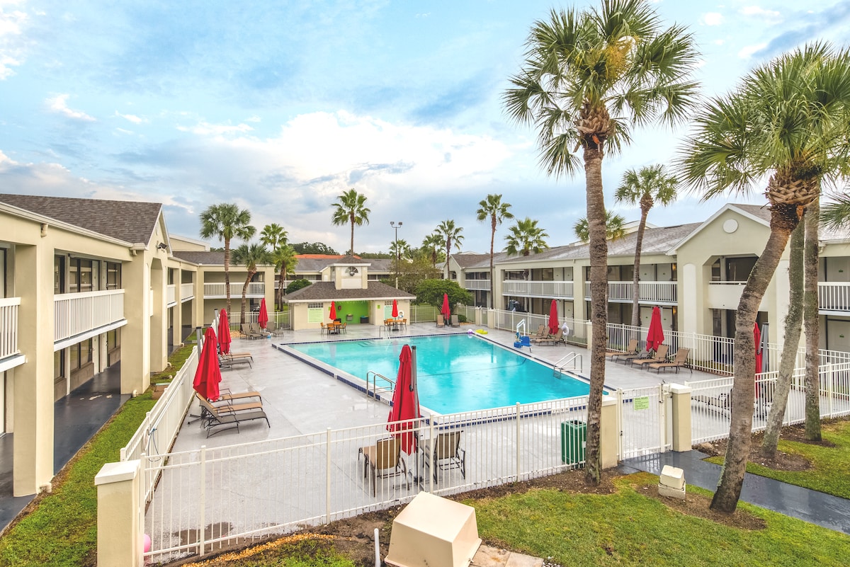 DISNEY SHUTTLE, PARKING & WIFI FREE!. Modern unit with tropical accents on the second level, accessible by stairs, overlooking the garden lounge, located in a private area of the condominium. Tourist area in the 192, JUST MINUTES TO PARKS, shopping centers, restaurants and other attractions. The unit is part of a recently renovated condominium, with modern design and a good taste. You will find yourself in a very welcoming environment with complimentary snacks & Disney transportation.