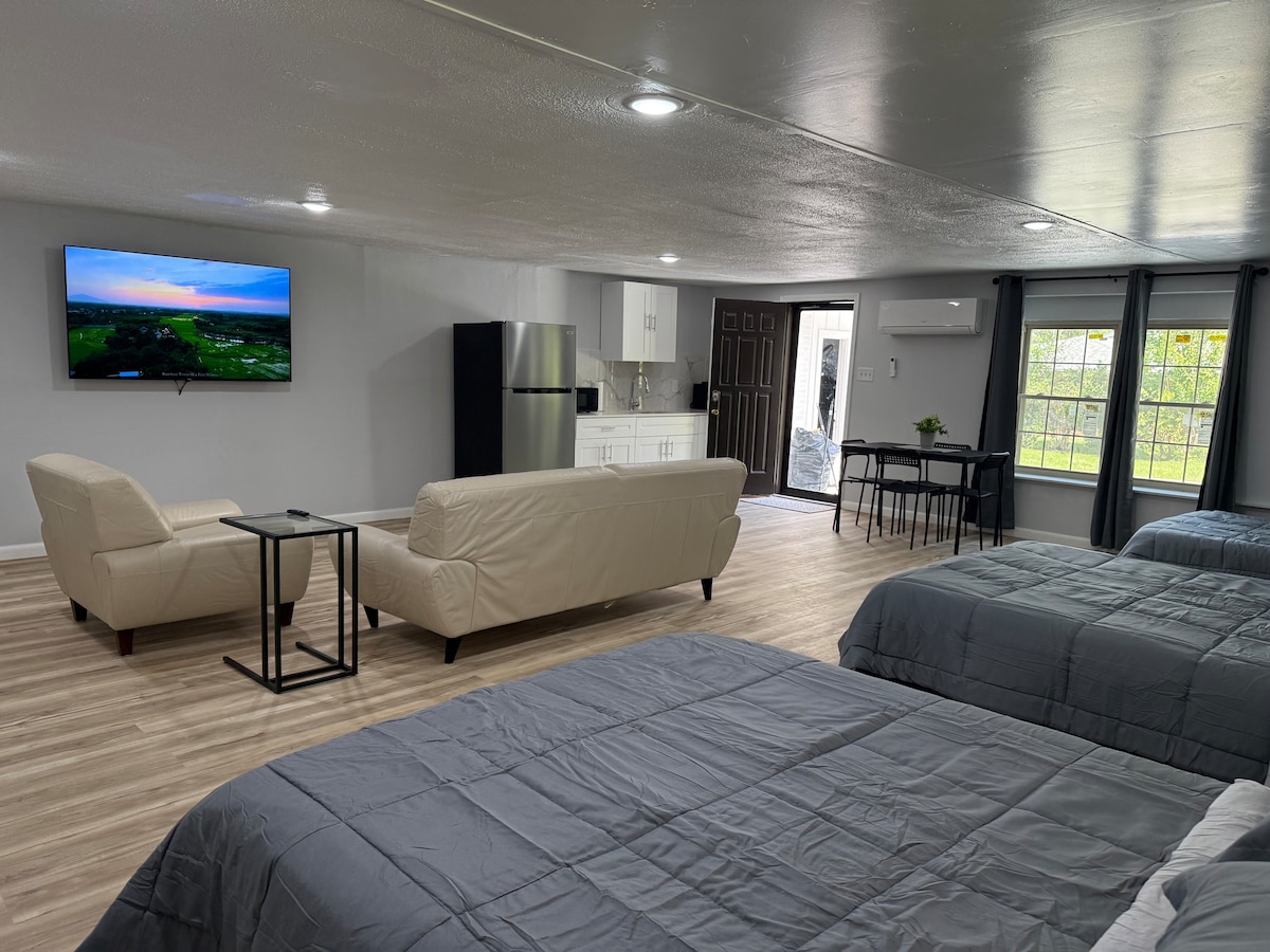 Cane River Living is the perfect choice if you're looking for a peaceful place to stay while exploring the historic Natchitoches area. This centrally-located guesthouse is just one mile from the downtown riverbank. It offers a beautifully-renovated studio with a king-sized bed, kitchenette, and spacious bathroom featuring seasonal decor. After a day of exploring downtown, unwind on the dock overlooking the lake and watch the sunset. Come and experience Cane River Living at its best!