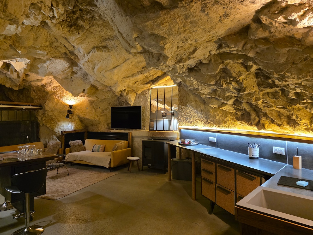 Bienvenue dans la Grotte du Moulin ! Ce loft naturel est encastré dans une motte calcaire et vous surprendra par son irrégularité. Il se compose d'une grande cuisine ouverte sur le séjour et d'une chambre avec salle de bains séparée par une porte de garage coulissante. Dans la chambre, vous disposez d'une lit double (160 cm) et dans le séjour un lit simple (90 cm) avec un canapé non convertible pouvant servir de petit lit une place.