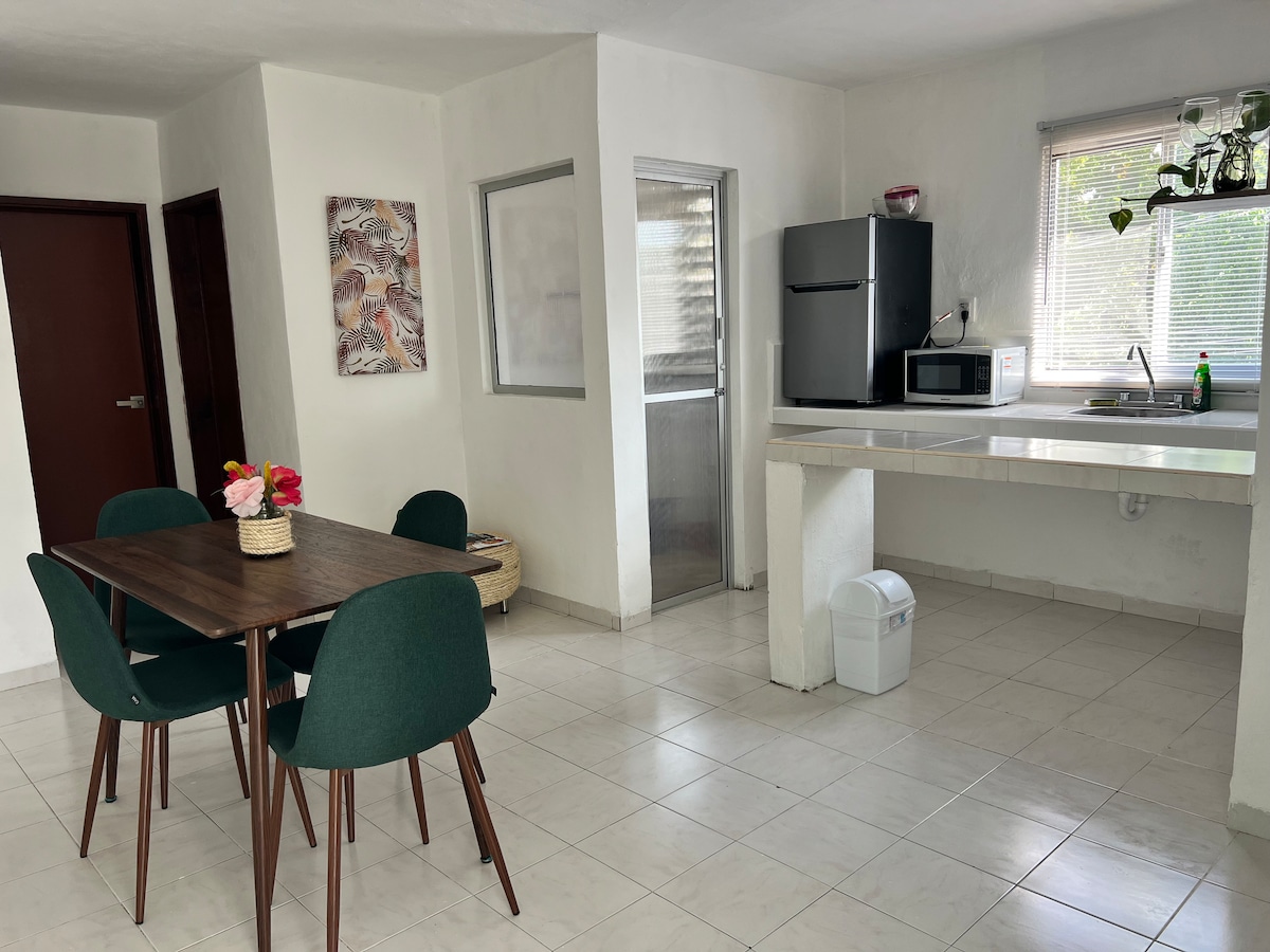 The new apartment for two is located a few streets from Paseo de Montejo de Mérida. It's a cozy, bright, and comfy space. It has all the amenities to have a pleasant and comforting stay: Full kitchen with refrigerator, induction stove, microwave oven and all necessary utensils, also has towels, hot water, internet, air conditioning.
