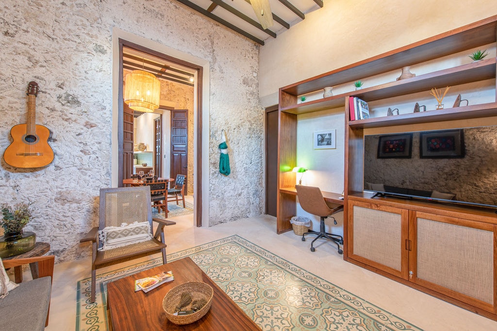 The ideal home base for exploring the Yucatan or relaxing in beautiful surroundings. Located on a quiet street in the historic center of Merida, the house accommodates up to 6 guests in three bedrooms, has a separate office/TV room for work or play, and features a large kitchen/living/dining area with plenty of natural light. You can relax under the pool's palapa or in the vine-covered central courtyard, have a barbecue on the rooftop terrace, or enjoy sunsets from the bell tower.