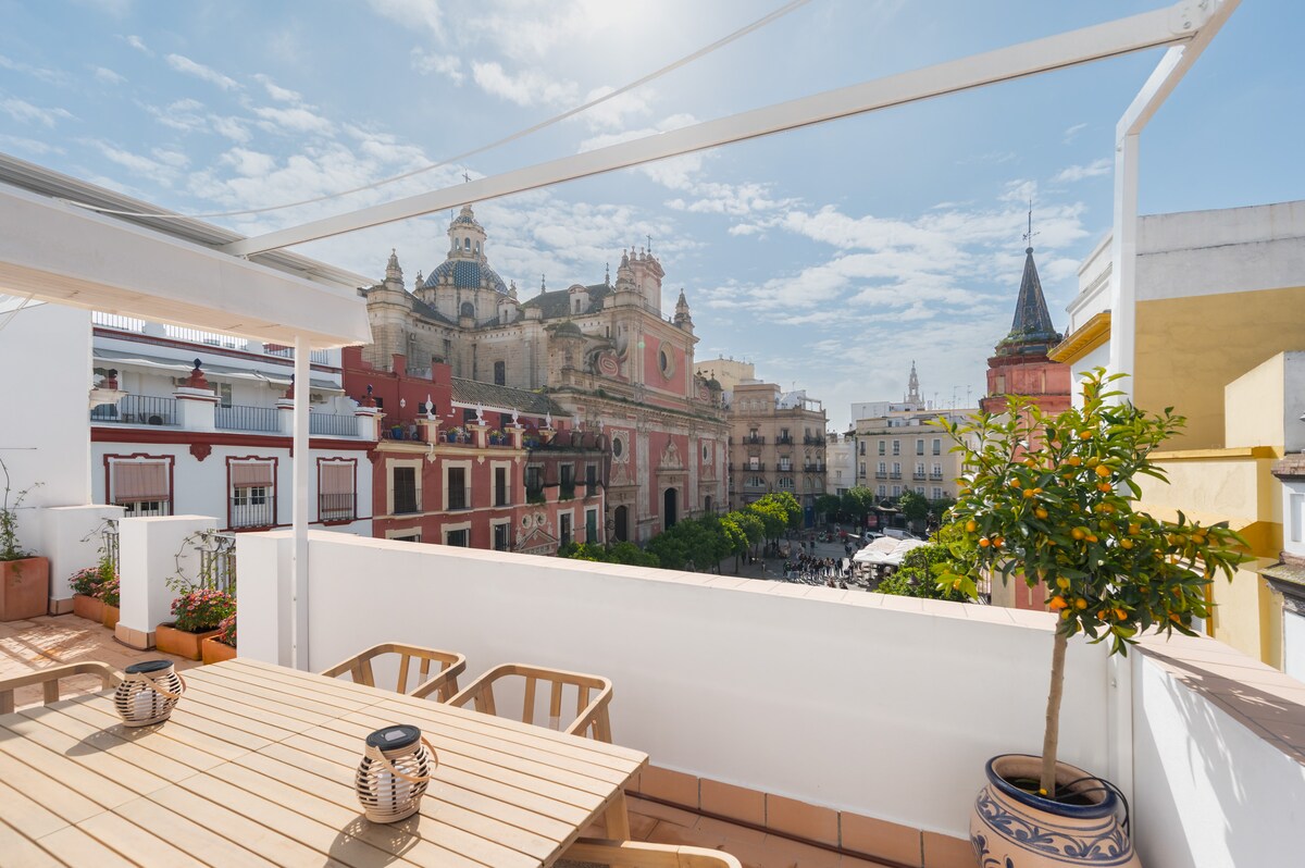 Cheerful, southern, and intoxicating, this apartment stands out for its meticulous decoration down to the last detail and the splendid terrace, from which you can admire the emblematic Church of the Savior and the tower of the old Mosque. The contrast and harmony between contemporary interventions and preserved elements provide magical journeys through time. Experience the city's legacy from within with all modern amenities. The entrance in the kitchen, new and modern, then opens to the large living room with two large French windows to the outside, and then to the bedroom with bathroom inside, with shower. The building has two floors (with an apartment on each one), plus the communal terrace with wonderful views of the Salvador church. The building and the apartment have been recently restored respecting the original elements. The apartment has been designed and equipped so that you can live in it as if it were your home in Seville: *High speed WiFi * Air conditioning hot / cold * Hair dryer *Flat Screen TV * Full kitchen (kitchenware, microwave, ceramic hob, refrigerator, freezer) * Nespresso machine *A toaster * Electric kettle * Orange Juicer * Clothesline, iron and ironing board. *Hangers in the closets. * Shampoo and Shower gel. You will find a corner dedicated to bookcrossing. Here you can take the book that interests you the most and leave one that you have read and that you want to share with other travelers. Laundry room + shared terrace with the apartment below, equivalent in size to this one. Upon arrival, we will offer our guests a tour of the property, and we will provide information about the area, walks, restaurants or any other site of interest that you may need. We will be happy to help you with everything you need, before and during your stay, according to your interests, and to share with you all of our best suggestions! The apartment is located in a unique enclave, within the monumental and commercial area of historic downtown Seville. Literally next to the Church of El Salvador and a few minutes from the Santa Cruz neighborhood, it allows you to forget about the car. With the Cathedral on one side and the Plaza Encarnación Market (Metropol Parasol) on the other, it is an area characterized by masterfully connecting the old and the contemporary, offering one of the most charismatic corners of the city. Excellent location without having to travel or use public or private transportation. You will always be close to everything. From the apartment you can walk to anywhere in the historic or commercial center in a few minutes, or even rent bicycles. In the heart of Seville's social and cultural offering! Wonderful apartment located in the heart of historic downtown Seville, in a charming and attractive building. In a unique enclave, on a street perpendicular to the beautiful Plaza del Salvador, a few steps from the Cathedral and places of great historical and artistic interest. The apartment is located on the second floor and has a 40m2 terrace shared with neighbors. The apartment has been designed and equipped so that you can live in it as if it were your home in Seville. We personally welcome guests. The house will be at your disposal and everything ready for your stay, the beds made and a set of towels provided for each guest.