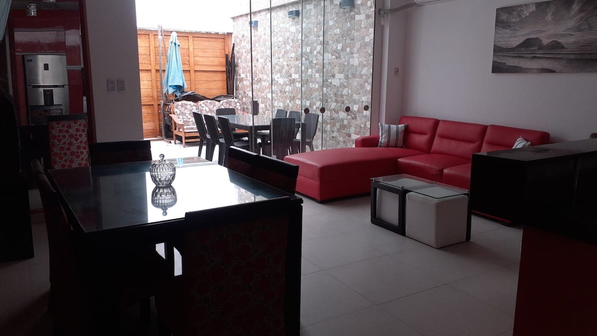 Beach house in front of park in private condominium Playa Azul, 15 meters from the boardwalk, large terrace with large grill, children's pool with ocean view. There are common areas for sports, swimming pool and children's games, swimming pool and games for adults, restaurant and market (summer season) Located 5 minutes from Cerro Azul, 15 minutes from Tottus and 20 minutes from Wong Asia. Ideal for spending the pandemic with the family, it has TV and Directv with HBO Premium package, optional WIFI 24 hour security.