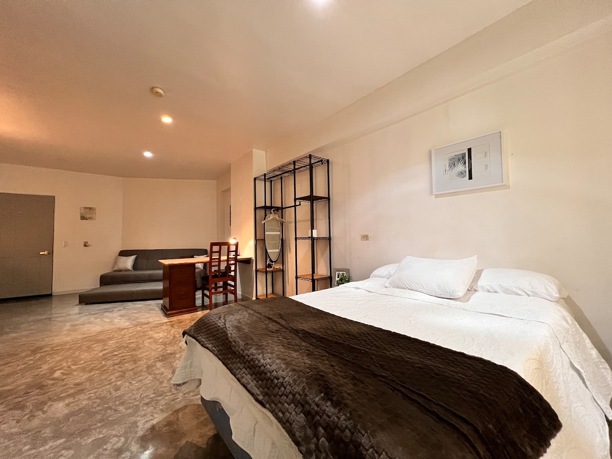 It is a Loft type room with Wi-Fi 100 mgb/s with colonial cedar furniture. with full bathroom and one of the most necessary to feel comfortable. King size bed, inflatable mattress, dining room, living room divided with a screen, Rustico TV. Netflix. Full bathroom and a powder room. Kitchenette, refrigerator, air conditioning, mini split 2 ton. Large closets with drawers, safe.