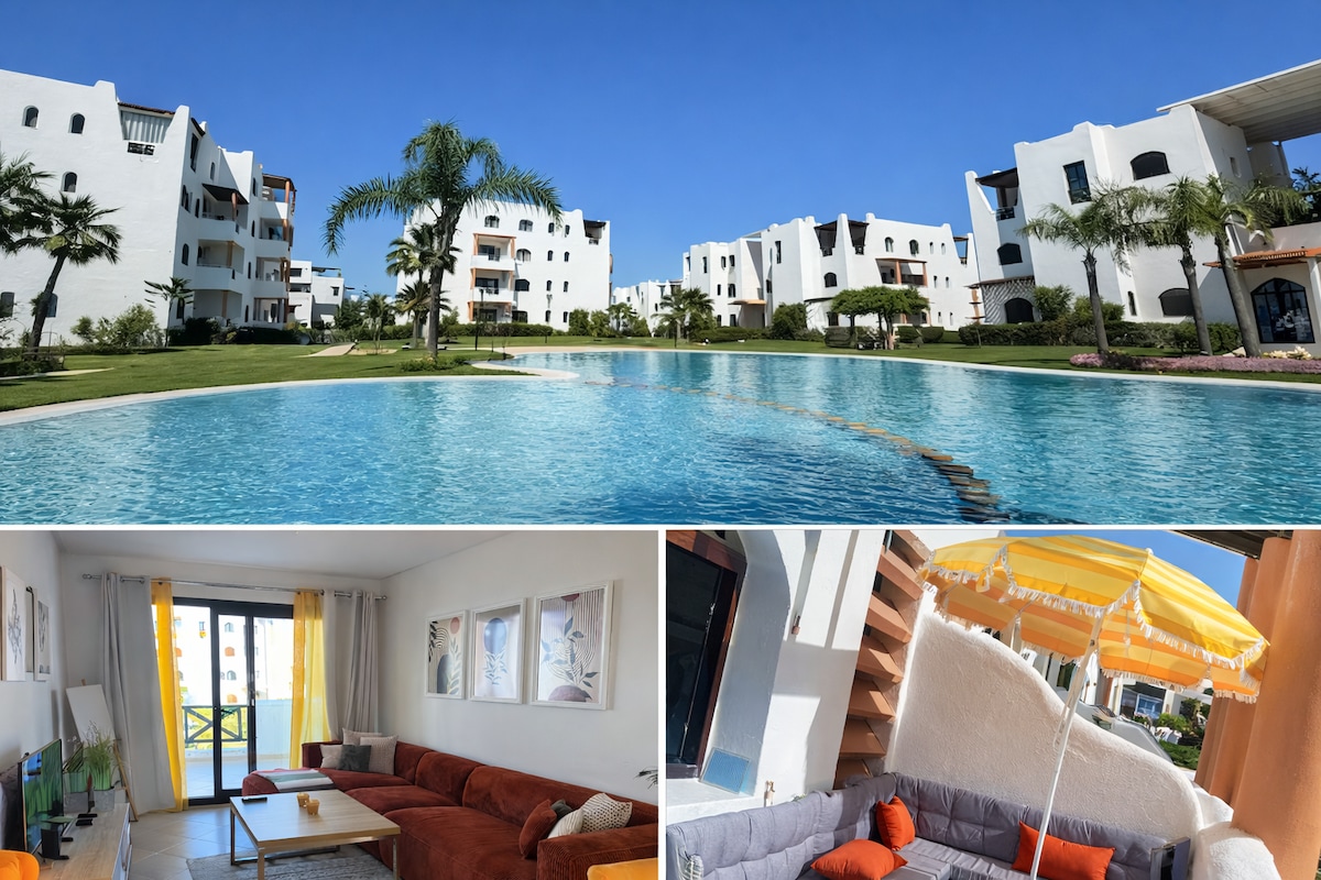 Dream apartment with sea view & pool in Cabo Negro, Morocco. Master suite, children's room, equipped kitchen, bright living room with connected TV, dining room for 8 people. Residence with 2 large swimming pools, slide, mini soccer fields, pétanque, playground. Quick access to beach, restaurants, shops, Water Park, Quad, horseback riding, golf course. Parking and delivery service (Glovo) available. Ideal for a family vacation. Warning: pool not operational in winter from 1/10 to 5/15