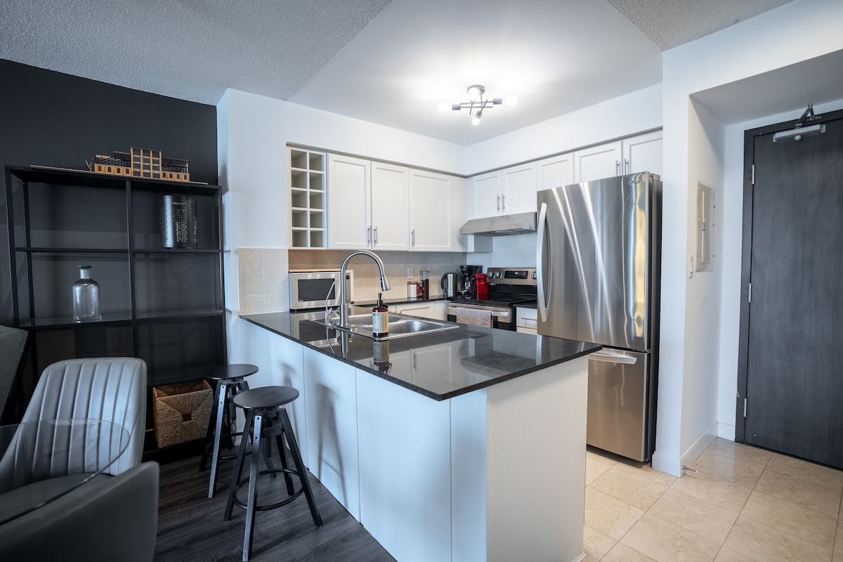 This one-bedroom, two-bathroom suite on the 40th floor offers approximately 750 square feet of open-concept living. The bright and spacious layout features quality finishes, including granite countertops, stainless steel appliances, and floor-to-ceiling windows. All furnishings are of designer quality, creating a stylish modern and comfortable atmosphere. The skyline and city lights add to the overall experience. Suite includes, King-size bed, a work desk, washer/dryer, and plenty of space!